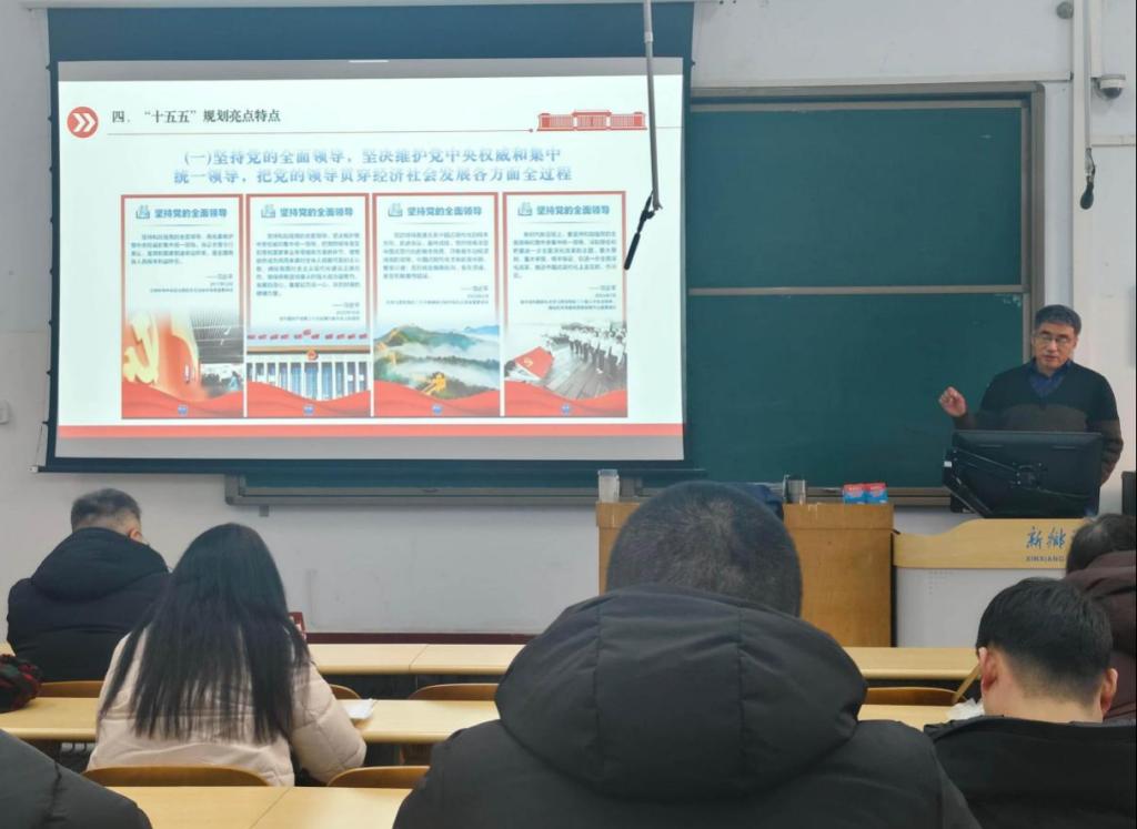 本次宣讲邀请马克思主义学院副教授万庆老师作为主讲嘉宾,围绕党的二十届四中全会的重大政治意义、核心部署要求,结合学科的行业属性与人才培养方向展开解读:既从宏观层面阐释了全会对推进国家治理体系和治理能力现代化的战略规划,也从微观角度链接专业实际——引导同学们思考“如何提升专业能力,服务城乡建设、助力高质量发展”,让抽象的精神内涵转化为可感知的实践方向。
