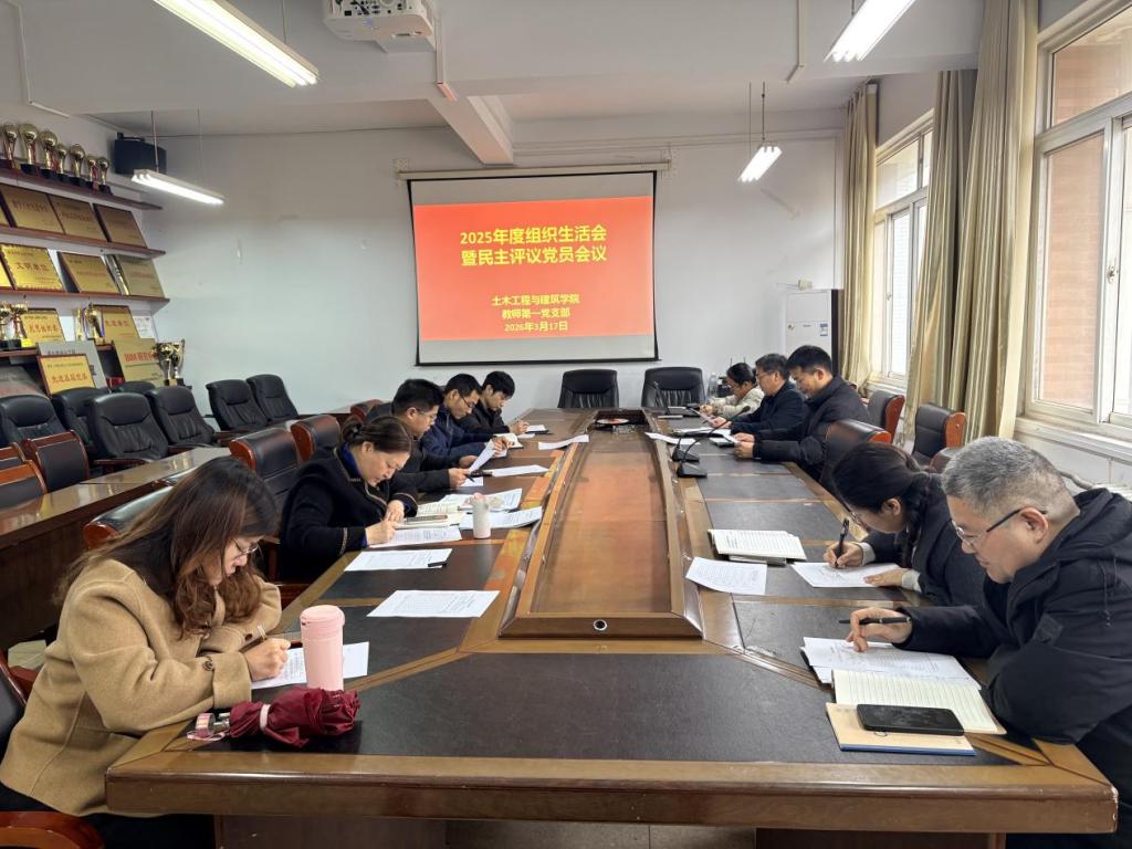 2026年3月17日,土木工程与建筑学院教师第一党支部召开2025年度组织生活会暨民主评议党员会议。会议分政治理论学习、组织生活会、民主评议党员三个议程进行。会议由党支部书记韩春主持,支部全体党员参加。